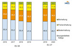 Die Angabe der Plätze für Legehennen (LH) bezieht sich nach dem Austritt des Vereinigten Königreichs auf das Gebiet der EU 27. Damit wurde die LH-Kapazität in der EU 27 im Vergleich zum Zählzeitpunkt 2019 um 1,6 % ausgeweitet. Die meisten Hennen in der EU leben in ausgestalteten Käfigen. Ihr Anteil belief sich 2020 auf 48,1 %. Im Jahr 2019 waren es im Gebiet der EU 27 noch 49,5 %. Insgesamt gab es im April 2020 noch 198,8 Mio. Hennenplätze in ausgestalteten Käfigsystemen, 140,5 Mio. Bodenhaltungsplätze, 49,2 Mio. in Freilandsystemen und 24,8 Mio. Bioplätze.