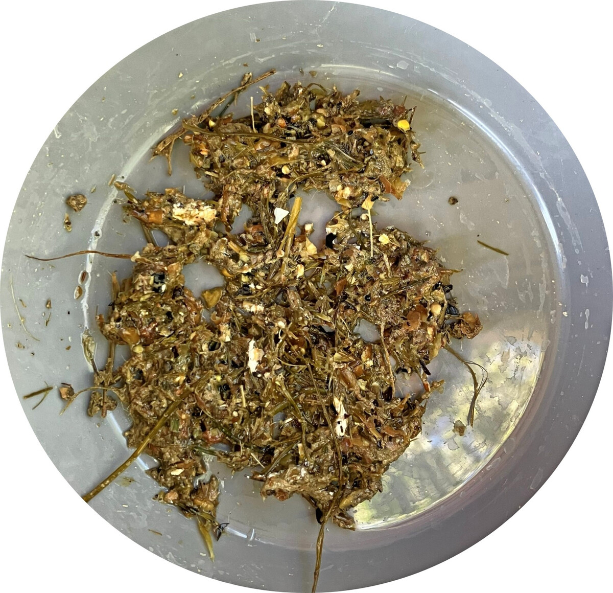 Hierzu wurden fünf repräsentative Kotproben je Probennahmetag zu je 20 g eingewogen und mittels Wasser durch ein handelsübliches Teesieb gewaschen. Das Verfahren wurde standardisiert durchgeführt, was bedeutet, dass immer die gleiche Einwaage, dasselbe Sieb, der gleiche Wasserdruck und die Waschzeit angewendet wurden. Das Verfahren der Kotwaschung ist in der Rinderfütterung ein bereits etabliertes Verfahren, um Rückschlüsse auf die Darm- bzw. Pansenfunktion ziehen zu können.