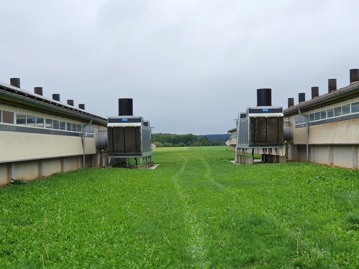 Eine Besonderheit seines Betriebs sind die Außenklimabereiche, die an allen drei Mastställen angebaut wurden. Die Ställe nennen sich Jalousienställe. Das Prinzip: Ein zusätzlicher Wintergarten schließt sich an den Innenraum an. Durch Gitterflächen kommt frische Luft hinein, zugleich haben die Tiere Sichtkontakt nach draußen. So erleben sie Lichtwechsel, Temperaturschwankungen und Geräusche, die es im geschlossenen Stall nicht gibt.
