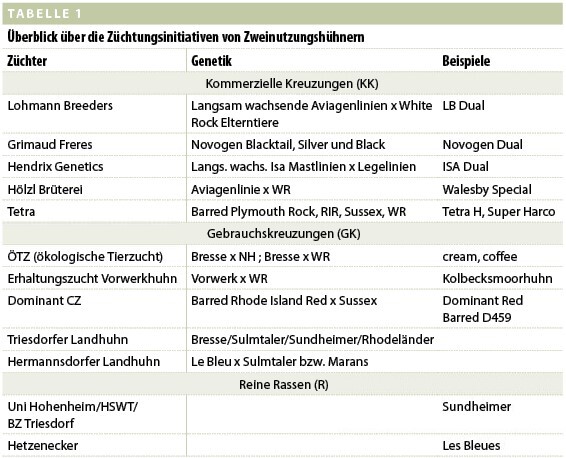 Große Geflügelzuchtunternehmen haben bereits 2012 Zweinutzungshühner gezüchtet und vermehrt. Die Lohmann Braun Dual (Lohmann breeders), die Walesby special, oder auch die Novogen Dual Henne wurden unter konventionellen Bedingungen an der Landesanstalt in Kitzingen und nach Grundsätzen des ökologischen Landbaus an der HS Weihenstephan geprüft. Es handelte sich meist um Kreuzungen von WR mit langsam wachsenden Mast ET. Die daraus fallenden E&F-Hühner zeigten ordentliche Zunahmen von 29 bis 43 g (siehe Tabelle 3) und eine gute Schlachtkörperkonfirmation mit einer respektablen LL von 228 bis 265 Eiern.