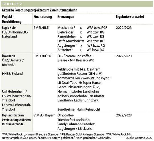 Es zeigt sich, dass reine „Hobbyrassen“ sowohl in der Legeleistung als auch im Fleischertrag sehr weit vom „idealen Zweinutzungshuhn“ entfernt sind. Dies gilt insbesondere für leichte Legerassen, deren tatsächliche ø Legeleistung zum Teil deutlich unter den Standards des BDRG (140 bis 200 Eier) liegt. Die täglichen Zunahmen der Hähne bewegen sich oft nur zwischen 10 bis 20 g. Die Varianz innerhalb einer Rasse, zwischen Züchtern und Stämmen (väterliche Halbgeschwister-Gruppen) ist allerdings sehr hoch. So sind mittels langjähriger Selektion durchaus Leistungssteigerungen möglich. Auf Heterosis muss in der Reinzucht allerdings verzichtet werden. Selbst wenn es gelingt, nach Jahrzehnten ein zufriedenstellendes „reinrassiges Zwiehuhn“ zu züchten, stellt sich das Problem der kontinuierlichen Belieferung der Landwirte mit größeren Stückzahlen. Neben der gezielten Paarung, Leistungserfassung und Selektion in den Basiszuchten müssten Vermehrungsherden aufgebaut werden. Trotz aller Vorbehalte gibt es ambitionierte Initiativen mit regionalem Bezug. Beispielsweise wird im Öko2Huhn-Projekt von einer Kooperation der Uni Hohenheim, der HS Weihenstephan Triesdorf mit den Landwirtschaftlichen Lehranstalten Triesdorf der Aufbau einer Zuchtpopulation des Baden-Württembergischen Sundheimer Huhnes geprüft (siehe Tabelle 2).