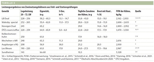 Tabelle 3 zeigt, dass einige Gebrauchskreuzungen schon heute ca. 220 bis 250 Eier mit befriedigendem Eigewicht produzieren können. Die täglichen Zuwachsraten der Hähne liegen zwischen 22 und 29 g (siehe Tabelle 3 ÖTZ: Bresse x WR und Mechelner x WR). Die Futterverwertung, die Zuwachsrate, die Schlachtausbeute und der Brustmuskelanteil der Hähne dieser GK müssten noch verbessert werden. Der Vorteil von GK liegt im Zusatznutzen. So könnten auf diesem Weg vom Aussterben bedrohte Hühnerrassen erhalten werden. Ein Beispiel wäre das Kolbecksmoorhuhn, eine Kreuzung des noch vor einigen Jahren stark gefährdeten Vorwerkhuhns mit kommerziellen White Rock-Elterntieren der Lohmann Breeders. Durch den Verkauf dieses Zweinutzungshuhns konnte ein Erhaltungszuchtring aufgebaut und die Rasse des Vorwerkhuhns stabilisiert werden. Derzeit sind laut Roter Liste der GEH (2021) elf Hühnerrassen extrem gefährdet und sieben Rassen als hoch gefährdet eingestuft. Dazu gehören z. B. für die Gebrauchskreuzung interessante, großrahmige, schwere Rassen wie die Mechelner oder die Deutschen Langschan und das Deutsche Lachshuhn. Aber auch die Rassen Bresse Gauloise und Maran sind interessante Anpaarungspartner für Braunleger-ET-Linien kommerzieller Legehennen-Zuchtfirmen oder der ökologischen Tierzucht (ÖTZ).